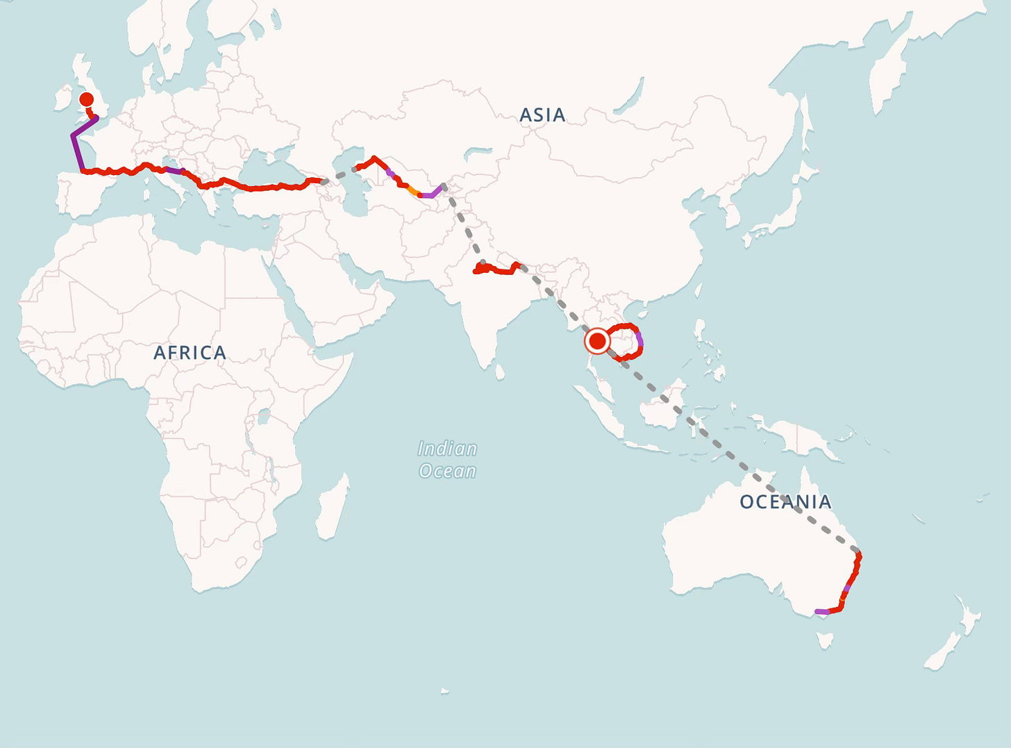 My 35,000 km journey began in January 2024 in North Wales, cycling south through England before crossing the Bay of Biscay by ferry into Northern Spain.