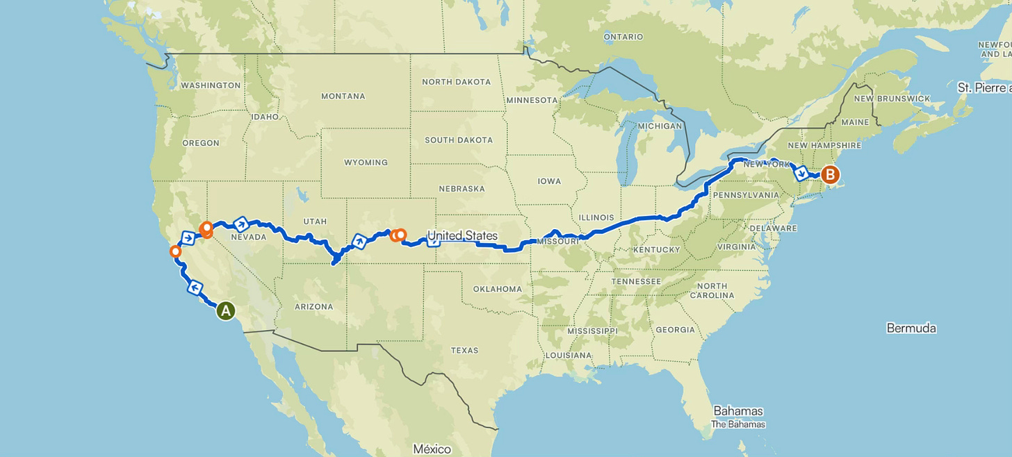 In total, the route runs coast-to-coast, and crossing a wide range of landscapes — coastal roads, mountain passes, high desert, farmland, and eastern forests.