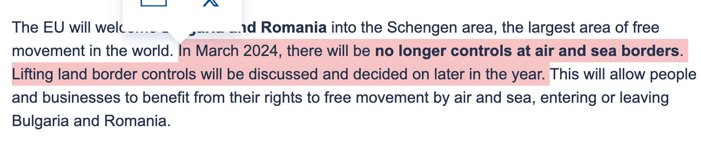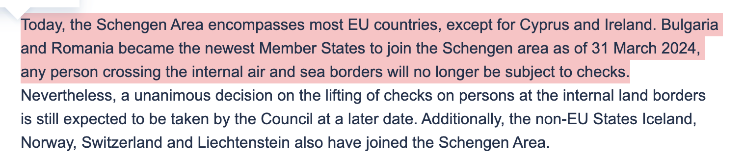 As of March 31st 2024, Bulgaria and Romania joined the Schengen Area.