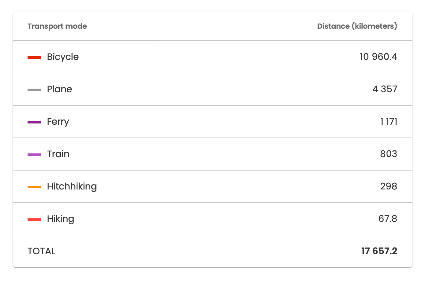 TravelMap allows me to see the total distance of each transport type that I have used, allowing me to see how much of the 17,600km I’ve covered by bike (62.27%), vs by plane (24.76%), hitchhiked (1.69%) etc, which I think is an awesome feature.